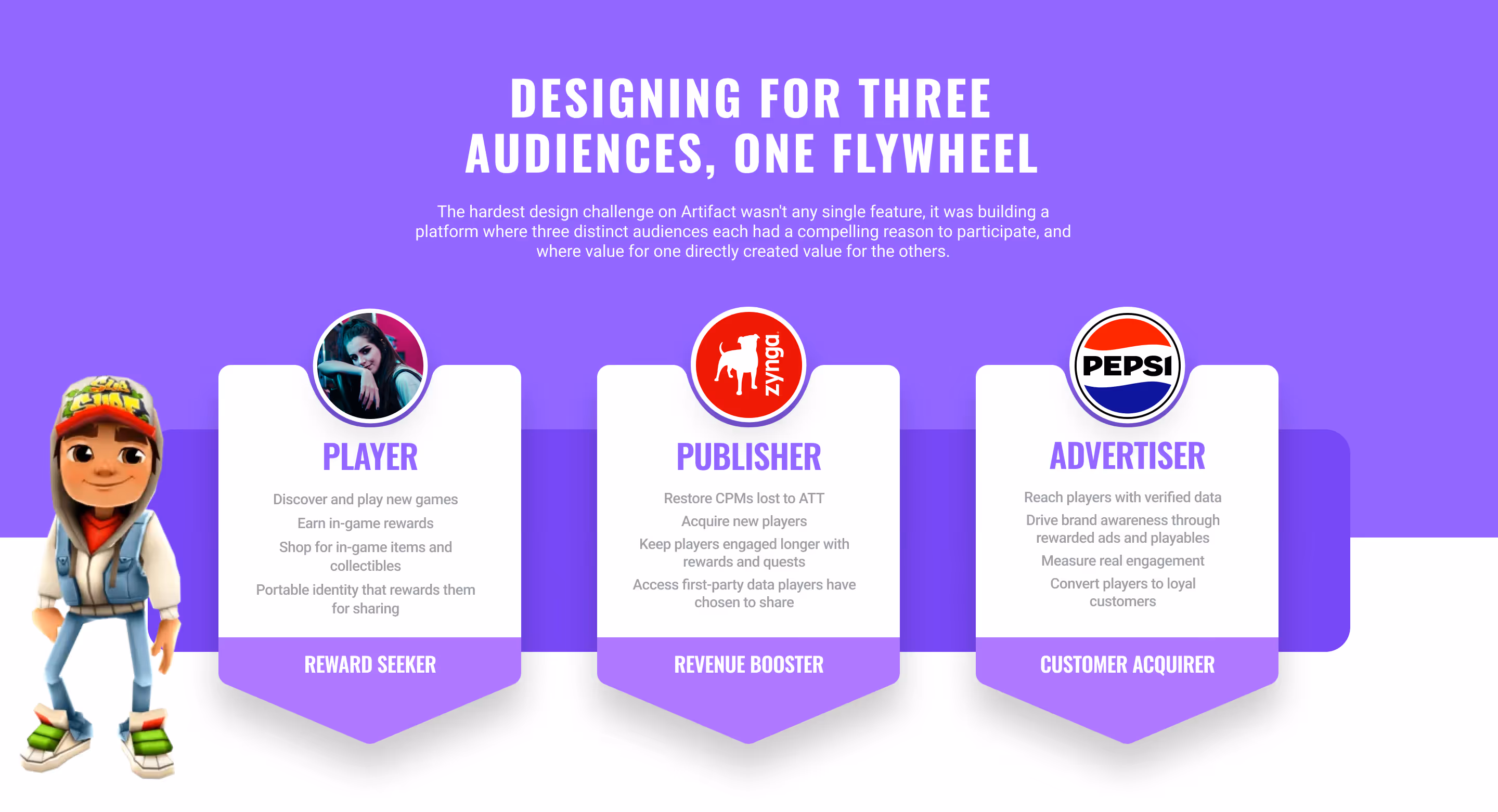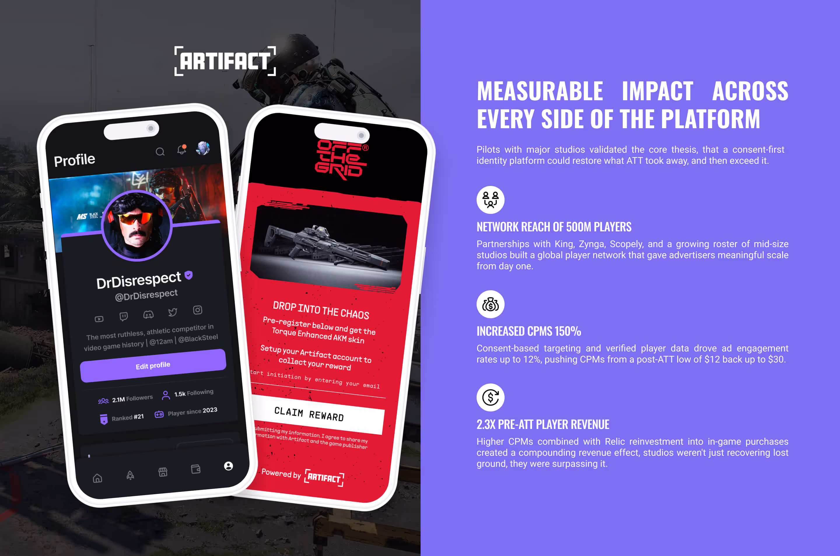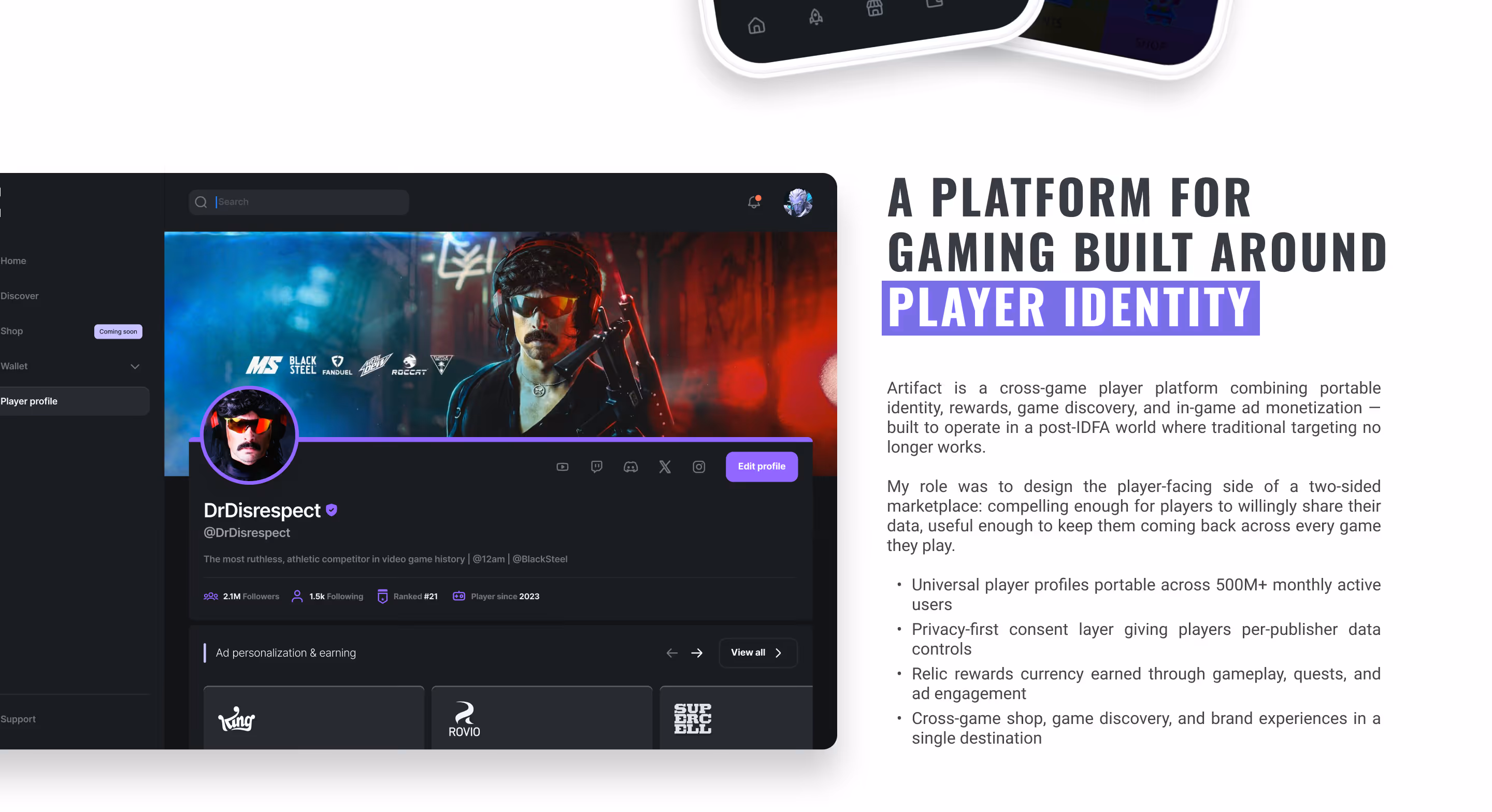 Artifact is a platform built around gaming digital identity, game discovery, rewards, and user acquisition ad tech. It allows players to create a universal player profile that can be taken to any game they play with rewards given to players for sharing their data, their play time, quests, and more. I was asked to create the product roadmap and designs for the platform, rich media ad flows, and in-game player experience views.