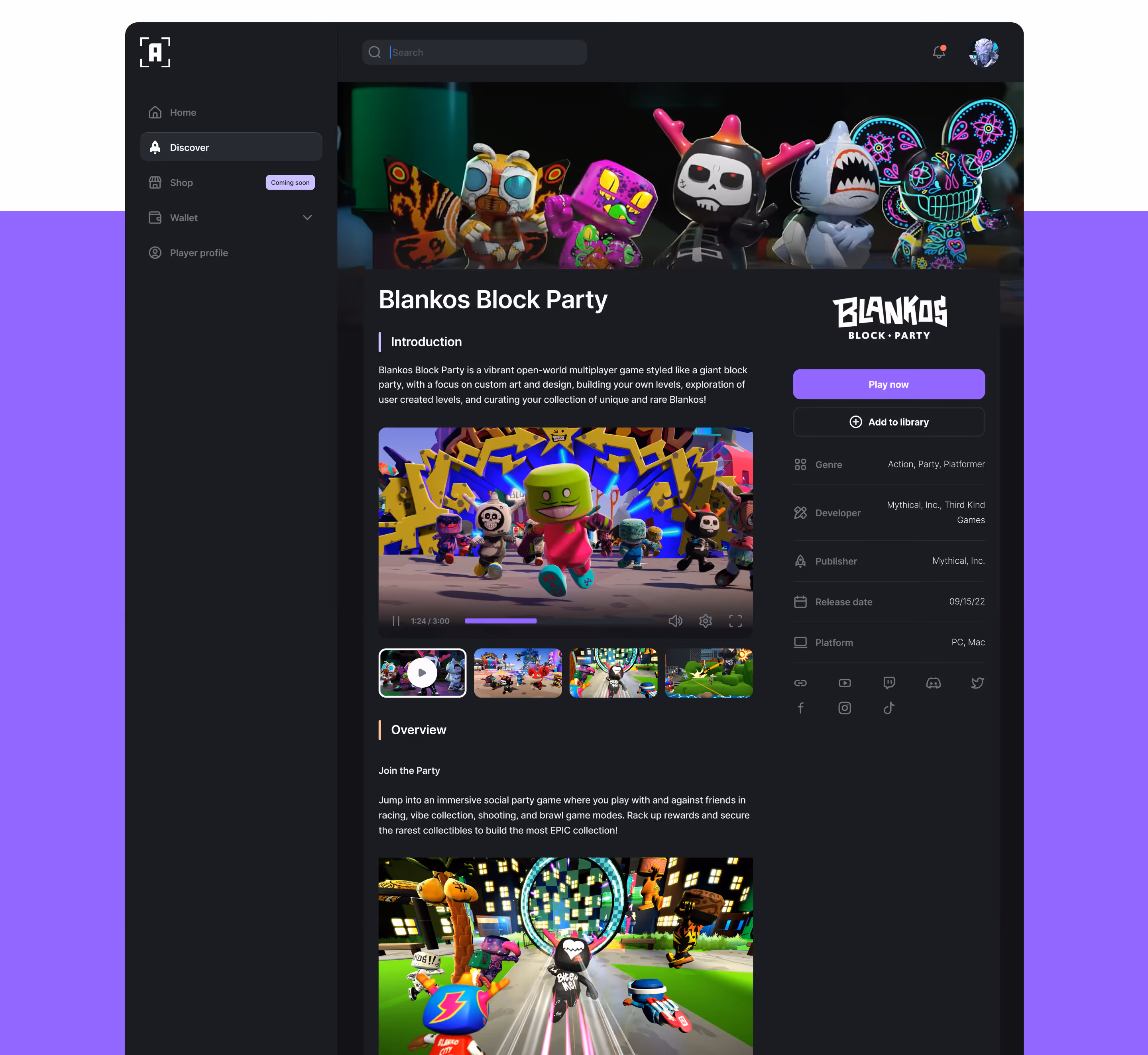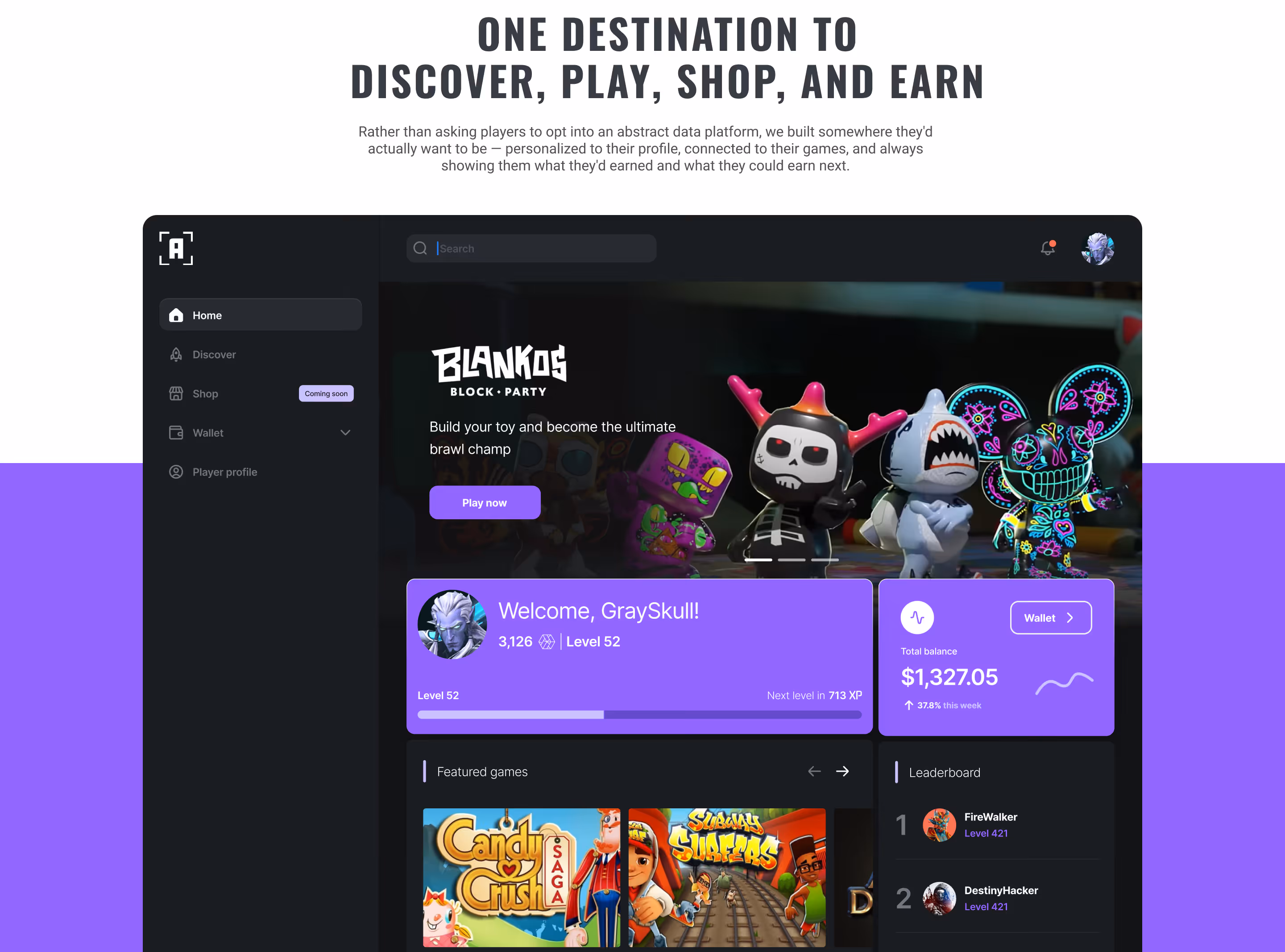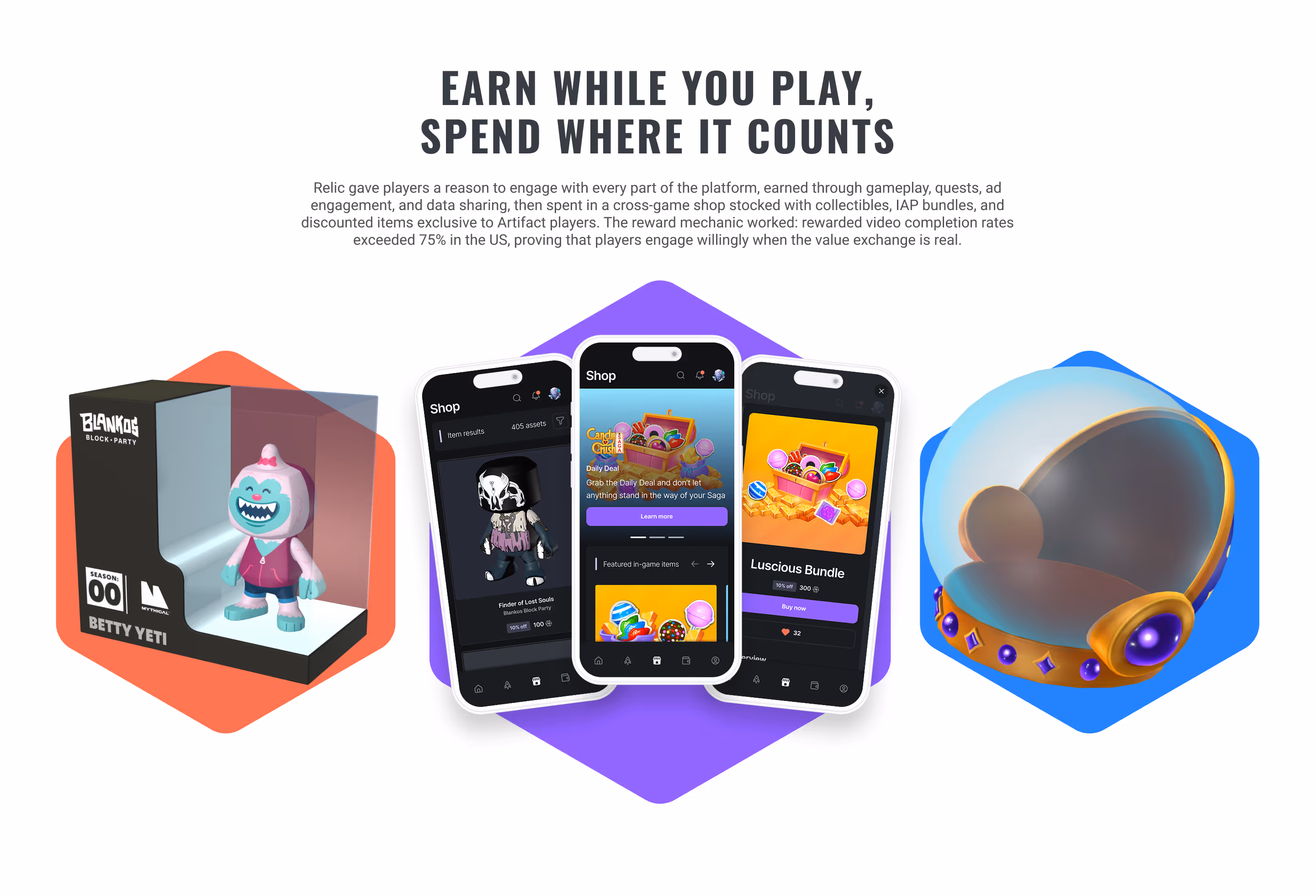 I crafted a player experience that feels native to games and familiar on the platform side. The platform side contains the Home, Discovery, Shop, Player Profile, and fully wallet functionality for web3. This first version of the product engages players and has launched Artifact to close a $2M venture capital raise as a business.